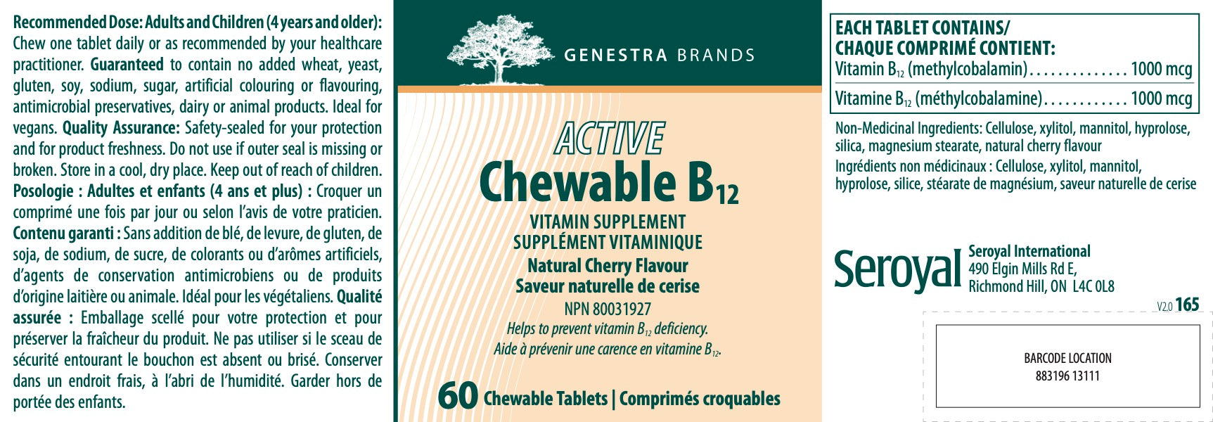 ACTIVE Chewable B12 soutient la formation des globules rouges et le métabolisme des macronutriments au moyen d'une dose concentrée (1 000 mcg) de méthylcobalamine, la forme active de vitamine B12 la plus compatible pour le corps. La carence en vitamine B12 est l'une des causes les plus courantes d'anémie liée aux nutriments, particulièrement chez les adultes de 65 et plus, chez qui on estime à 11 % les cas d'anémie liés à la B12.