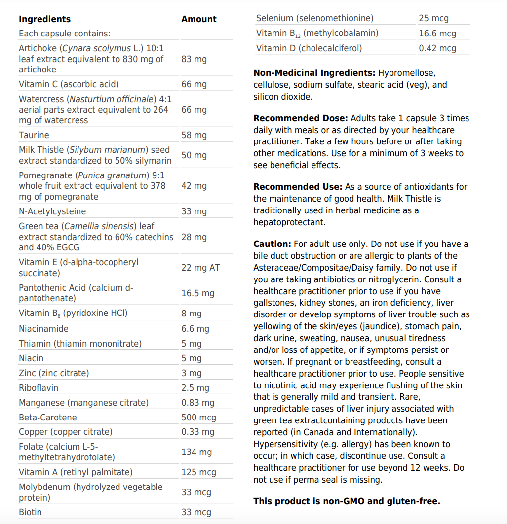Artichaut (Cynara scolymus L.) 10:1 extrait de feuilles équivalent à 830 mg d'artichaut ...... 83 mgVitamine C (acide ascorbique) ...... 66 mgCresson (Nasturtium officinale) 4:1 équivalent extrait de parties aériennes à 264 mg de cresson ...... 66 mgTaurine ...... 58 mgExtrait de graines de Chardon-Marie (Silybum marianum) standardisé à 50% de silymarine ...... 50 mgGrenade (Punica granatum) 9:1 fruit entier extrait équivalent à 378 mg de grenade......42 mgN-Acétylcystéine......33 mgExtrait de feuilles de Thé vert (Camellia sinensis) standardisé à 60% catéchines et 40% EGCG......28 mgVitamine E (succinate de d-alpha-tocophéryle) ...... 22 mg ATPantothénique (d-pantothénate de calcium) ...... 16,5 mgVitamine B6 (pyridoxine HCl) ...... 8 mgNiacinamide ..... .6,6 mgThiamine (mononitrate de thiamine) ...... 5 mgNiacine ...... 5 mgZinc (citrate de zinc) ...... 3 mgRiboflavine ...... 2,5 mgManganese (citrate de manganèse) ... ... 0,83 mgBêta-carotène ...... 500 mcgCuivre (citrate de cuivre) ...... 0,33 mgFolate (L-5-méthyltétrahydrofolate de calcium) ...... 134 mgVitamine A (palmitate de rétinyle) .. .... 125 mcgMolybdène (protéine végétale hydrolysée) ...... 33 mcgBiotine ...... 33 mcgSélénium (sélénométhionine) ...... 25 mcgVitamine B12 (méthylcobalamine) ...... 16,6 mcgVitamine D (cholécalciférol) ...... 0,42 mcg