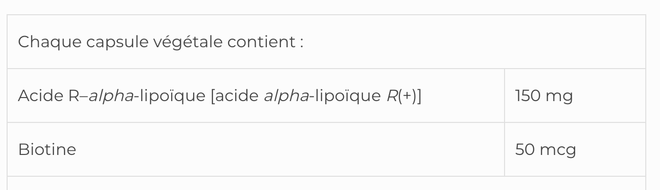 L'acide alpha-lipoïque (ALA) R+ est le seul antioxydant qui soit à la fois liposoluble et hydrosoluble, ce qui est important car l'ALA peut accéder à toutes les parties des cellules vivantes, ce qui lui permet de piéger les radicaux libres et de protéger les cellules contre l'oxydation, et l'ALA R+ est l'une des rares substances capables de franchir la barrière hémato-encéphalique.