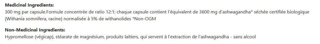 En plus de traiter extrêmement efficacement le stress et l’anxiété, notre ashwagandha est aussi propre et issu d’une source durable. Comme notre extrait affiche une concentration surpuissante de 12:1, chaque végécapsule de 300 mg contient l’équivalent de 3600 mg (300 mg x 12) d’ashwagandha sec certifié biologique et standardisé pour contenir un minimum de 5 % de withanolides. Résultat : un extrait à spectre complet à l’efficacité exceptionnelle qui préserve l’équilibre des diverses composantes de la plante originale ainsi que toutes ses qualités adaptogènes et toniques essentielles.
