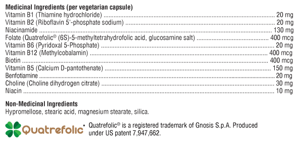 Le folate est fourni sous forme de 5-méthyltétrahydrofolate (5-MTHF), qui contourne les étapes métaboliques de la bioactivité du folate. Malgré des recherches montrant que l'acide folique et le 5-MTHF ont une biodisponibilité équivalente et qu'une supplémentation avec de fortes doses d'acide folique peut « forcer » sa conversion en une forme plus active, le 5-MTHF, peut être la forme préférée pour reconstituer le folate. Cela peut être particulièrement applicable aux personnes ayant des problèmes digestifs ou des variations génétiques du métabolisme des folates. Dans cette formule, le 5-MTHF est fourni sous forme de Quatrefolic, le sel de glucosamine du 5-MTHF. Des études in vitro et in vivo ont prouvé que Quatrefolic a une plus grande stabilité, solubilité et biodisponibilité que les formes de sel de calcium de 5-MTHF. Le folate est stocké en petites quantités dans les globules rouges (RBC), et il a été démontré que le folate de RBC est plus élevé après une supplémentation en 5-MTHF par rapport à l'acide folique et au placebo. De même, les patients ayant reçu 5 mg de 5-MTHF ont présenté des taux plasmatiques de 5-MTHF 700 % supérieurs à ceux des patients ayant reçu de l'acide folique.