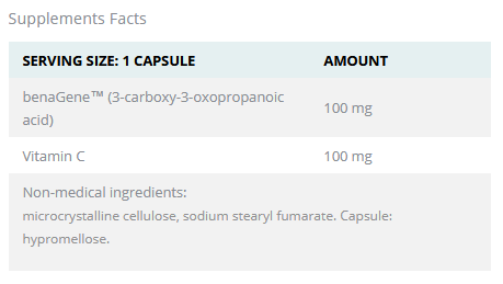 Exclusivement disponible au Canada, benaGene™ a été développé en 2007 par AOR qui en est le distributeur. Ce produit fournit une dose thérapeutique d’oxaloacétate stabilisé par l’ajout de la vitamine C et une posologie pratique d’une seule capsule par jour.