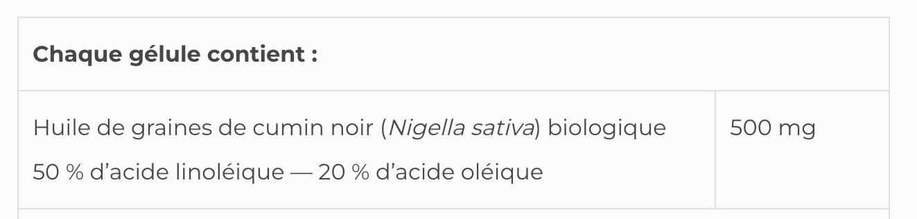 Ces graines contiennent un certain nombre de substances attribuées à leurs propriétés bioactives, notamment la thymoquinone, les saponines, les alcaloïdes et des niveaux élevés d’acides gras bénéfiques, notamment l’acide linoléique et l’acide oléique pour le maintien d’une bonne santé.