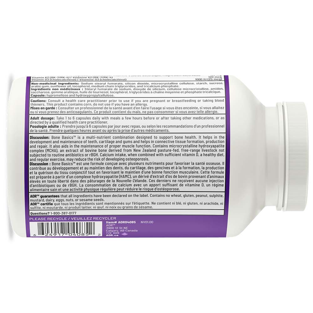 Bone Basics contient également d’autres éléments nutritifs tels que la vitamine D3, la vitamine K2, le bore, le magnésium, le manganèse, le zinc et le cuivre qui, en association avec le HAMC, offrent divers avantages tels que l’amélioration de l’absorption et de l’utilisation du calcium, et le soutien de la production du collagène qui est une composante essentielle de la structure de l’os.