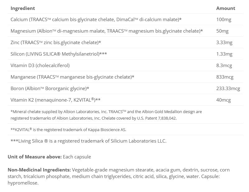 Cette formule est complétée par les nutriments nécessaires pour soutenir le processus de construction osseuse. La vitamine D3 est essentielle à l'absorption du calcium par le tube digestif, tandis qu'environ 50 à 60 % de tout le magnésium est en fait stocké dans les os et il est nécessaire pour activer les enzymes liées au métabolisme de la vitamine D3. La vitamine K2 s'est imposée comme un acteur clé dans la catégorie de la santé osseuse, avec sa capacité à activer deux protéines, l'ostéocalcine et la protéine matrice-GLA, afin de dériver le calcium vers le système squelettique et l'éloigner du système cardiovasculaire. Les oligo-éléments tels que le zinc, le manganèse et le bore jouent également un rôle crucial. Le zinc et le manganèse sont des cofacteurs de plusieurs enzymes impliquées dans la formation osseuse, tandis que le bore empêche l'excrétion du calcium par les reins. Il a été démontré que diverses combinaisons de tous ces nutriments affectent positivement les marqueurs de densité minérale osseuse.