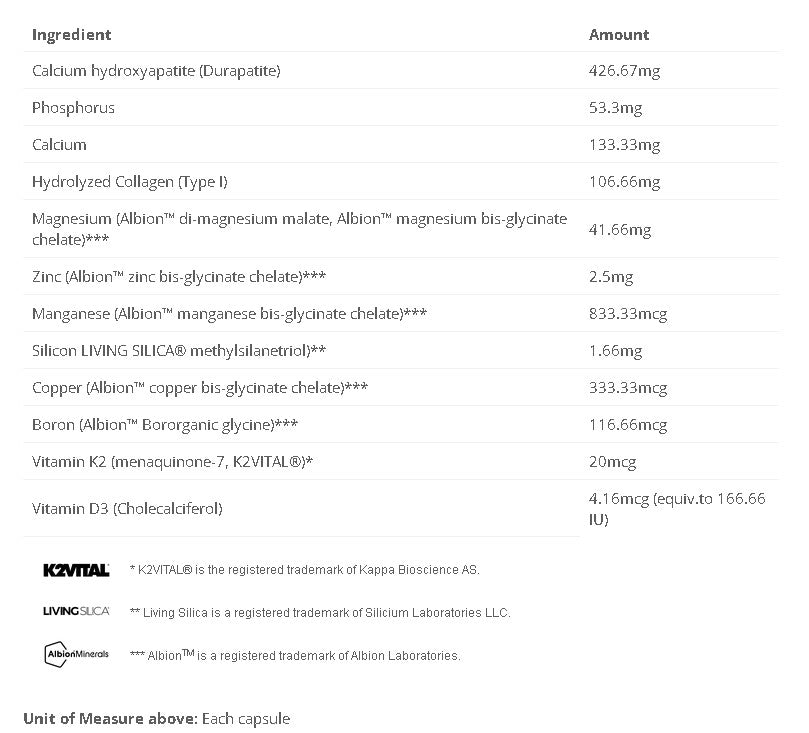 Un mélange complet de nutriments essentiels pour une santé osseuse optimale. L'hydroxyapatite microcristalline fournit du calcium à libération lente, ainsi que du phosphore, du collagène et d'autres facteurs de croissance pour stimuler les ostéoblastes et soutenir la densité minérale osseuse.