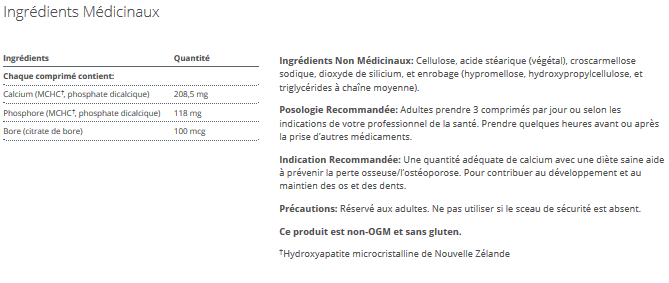 Calcium (MCHC†, phosphate dicalcique) ...... 208,5 mgPhosphore (MCHC†, phosphate dicalcique) ...... 118 mgBore (citrate de bore) ...... 100 mcg