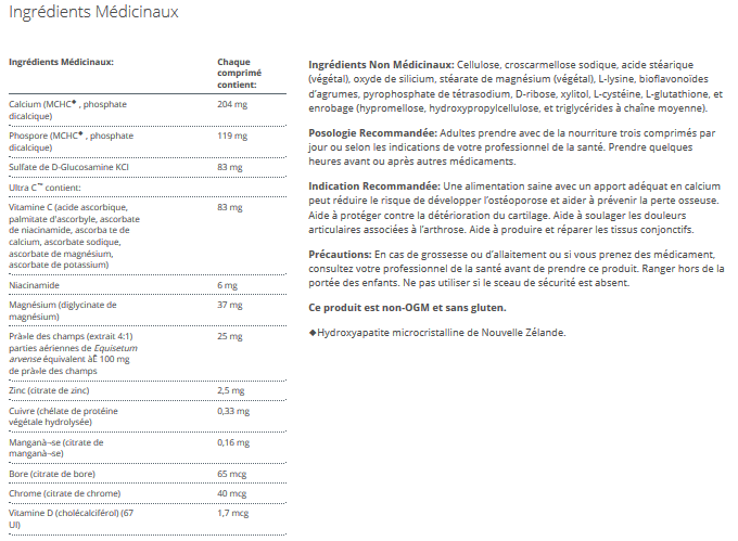 Calcium (MCHC◆ , phosphate dicalcique) ...... 204 mgPhosphore (MCHC◆ , phosphate dicalcique) ...... 119 mgSulfate de D-Glucosamine KCl ...... 83 mgUltra C™ apportant:Vitamine C (acide ascorbique, palmitate d'ascorbyle, ascorbate de niacinamide, ascorbate de calcium, ascorbate de sodium, ascorbate de magnésium, ascorbate de potassium) ...... 83 mgNiacinamide ...... 6 mgMagnésium (bisglycinate de magnésium) ...... 37 mgPerruche (Equisetum arvense) extrait de parties aériennes 4:1 équivalent à 100 mg de prêle ...... 25 mgZinc (citrate de zinc) ...... 2,5 mgCuivre (chélate de protéines végétales hydrolysées) ...... 0,33 mgManganèse (citrate de manganèse) ...... 0,16 mgBore (citrate de bore) ...... 65 mcgChrome (citrate de chrome) ...... 40 mcgVitamine D (cholécalciférol) (67 UI) ...... 1,7 mcg