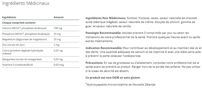 Calcium (MCHC†, phosphate dicalcique) ...... 100 mgPhosphore (MCHC†, phosphate dicalcique) ...... 55 mgMagnésium (bisglycinate de magnésium) ...... 25 mgZinc (citrate de zinc) ...... 2 mgCuivre (chélate de protéines végétales hydrolysées) ...... 0,25 mgManganèse (citrate de manganèse) ...... 0,25 mgVitamine D (cholécalciférol) ...... 0,63 mcg