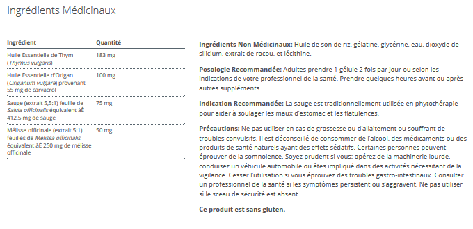 Huile essentielle de thym (Thymus vulgaris) ...... 183 mgHuile essentielle d'origan (Origanum vulgare) apportant 55 mg de carvacrol ...... 100 mgSauge (Salvia officinalis) extrait de feuilles 5,5:1 équivalent à 412,5 mg de sauge ...... 75 mgMélisse (Melissa officinalis) extrait de feuille 5:1 équivalent à 250 mg de mélisse ...... 50 mg