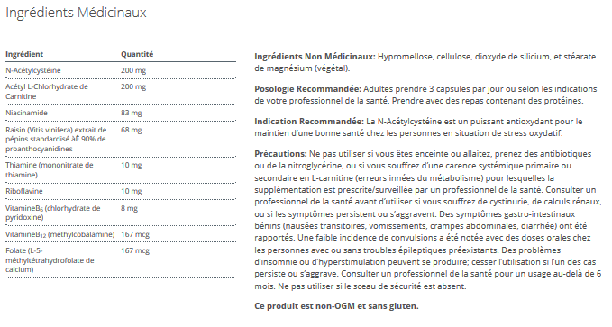 N-acétylcystéine ...... 200 mgAcétyl L-carnitine HCl ...... 200 mgNiacinamide ...... 83 mgExtrait de pépins de raisin (Vitis vinifera) standardisé à 90% de proanthocyanidines ...... 68 mgThiamine (mononitrate de thiamine) ...... 10 mgRiboflavine ...... 10 mgVitamine B6 (pyridoxine HCl) ...... 8 mgVitamine B12 (méthylcobalamine) ...... 167 mcgFolate (calcium L-5-méthyltétrahydrofolate) ...... 167 mcg