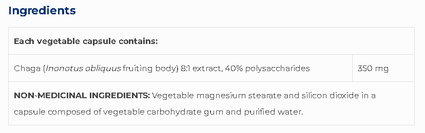 Le chaga est riche en nutriments, concentré en polysaccharides, flavonoïdes, acide bétulinique, polyphénols, minéraux, enzymes et plusieurs vitamines B, dont l’acide pantothénique, la riboflavine et la niacine.