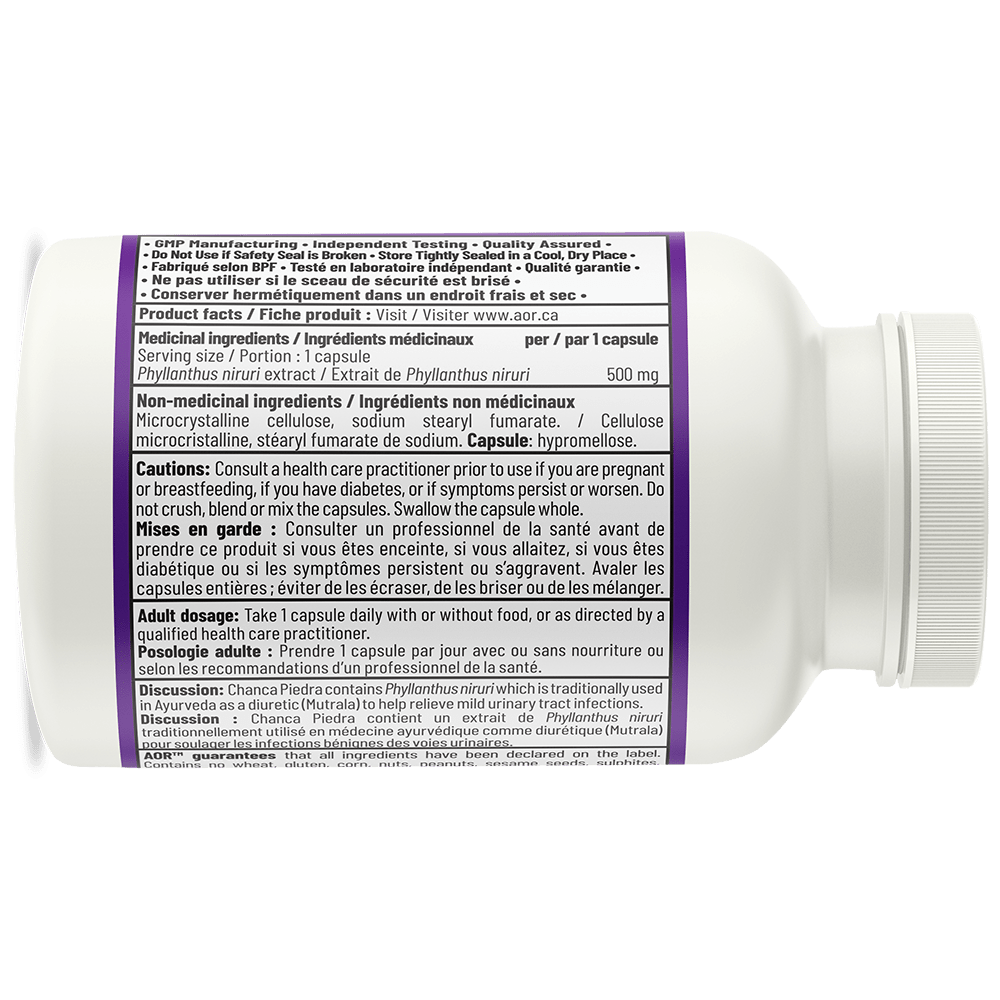 Les calculs biliaires et rénaux sont un problème de santé courant, particulièrement dans les régions où l’eau est rare ou chez les personnes à l’alimentation est riche en matières grasses et protéines. Le Chanca Piedra d’AOR offre une option naturelle pour des personnes souffrant de calculs rénaux ou biliaires chroniques et peut être utile pour soulager de légères infections urinaires.