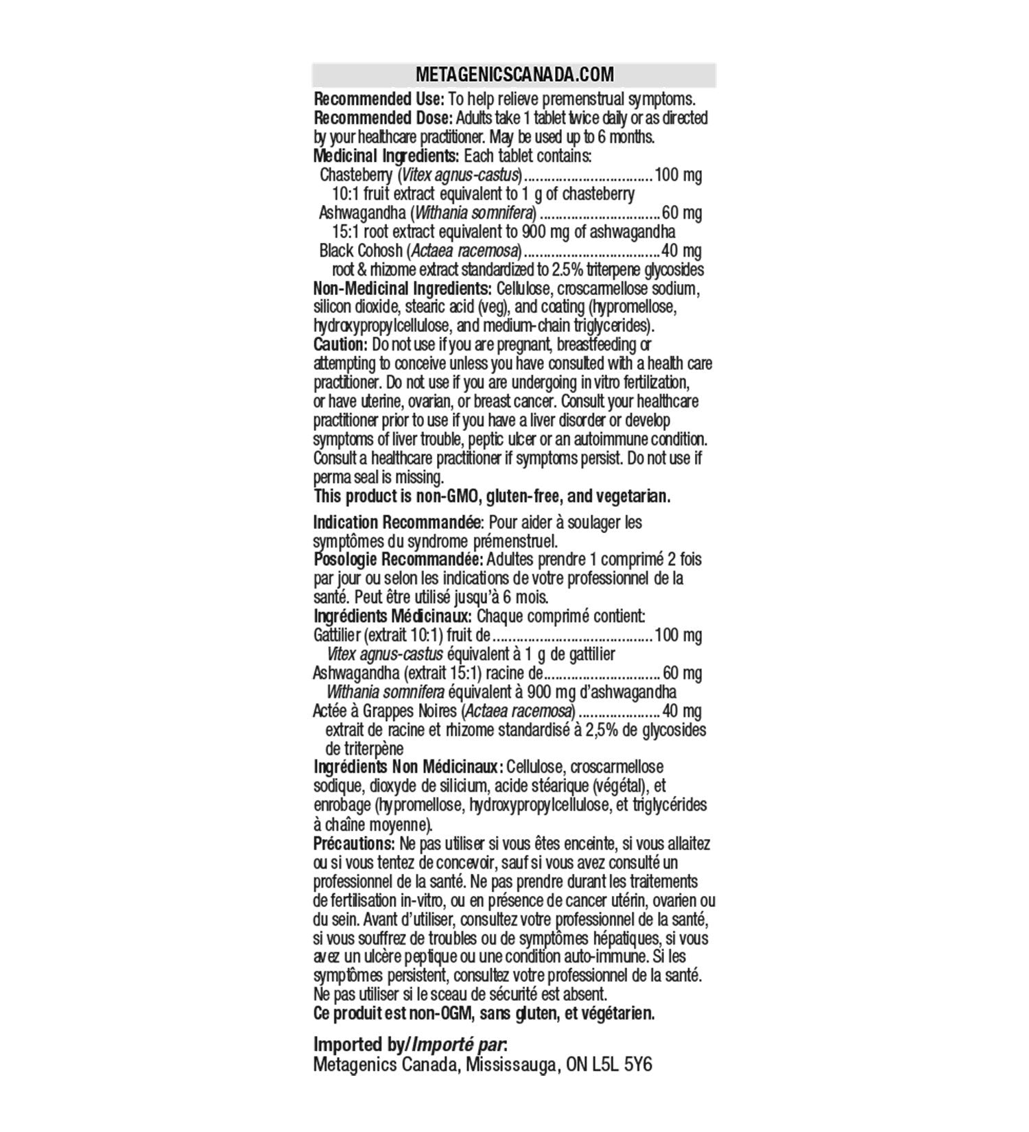 Gattilier (Vitex agnus-castus) Extrait de fruit 10:1 équivalent à 1 g de gattilier ...... 100 mgAshwagandha (Withania somnifera) extrait de racine 15:1 équivalent à 900 mg d'ashwagandha ...... 60 mgActée à grappes noires (Actaea racemosa) extrait de racine ; extrait de rhizome standardisé à 2,5 % de glycosides triterpéniques ...... 40 mg