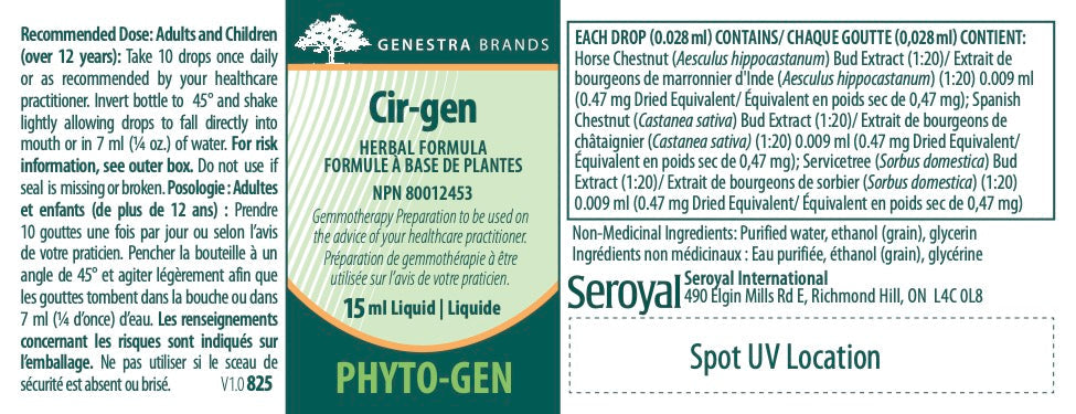Chaque goutte (0,028 ml) contient : Extrait de bourgeon de marronnier d'Inde (Aesculus hippocastanum) (1:20) 0,009 ml (0,47 mg Équivalent séché) Extrait de bourgeon de marronnier d'Espagne (Castanea sativa) (1:20) 0,009 ml (0,47 mg Équivalent séché) Extrait de bourgeon de tilleul (Sorbus domestica) (1:20) 0,009 ml (0,47 mg Équivalent séché) Arbre de service (Sorbus domestica) Extrait de bourgeon (1:20) (Sorbus domestica) 0.009 ml (0.47 mg Équivalent sec) Ingrédients non médicinaux : Eau purifiée, éthanol (grain), glycérine.