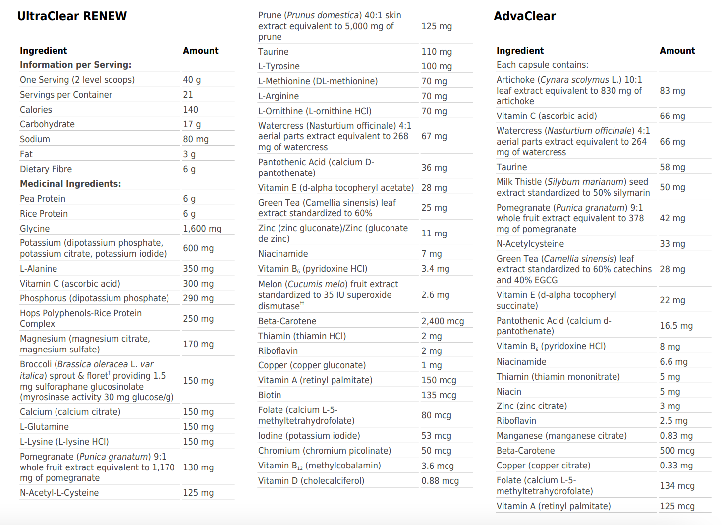 UltraClear™ RENEW : Isomaltooligosaccharides, fibre de pomme, jus de canne à sucre, huile d’olive, triglycérides à chaîne moyenne, saveurs naturelles, hibiscus et jus de carotte noire, dioxyde de silicium, acide citrique, gomme de xanthane, extrait de fruit de monk, gomme de guar, et extrait de romarin.