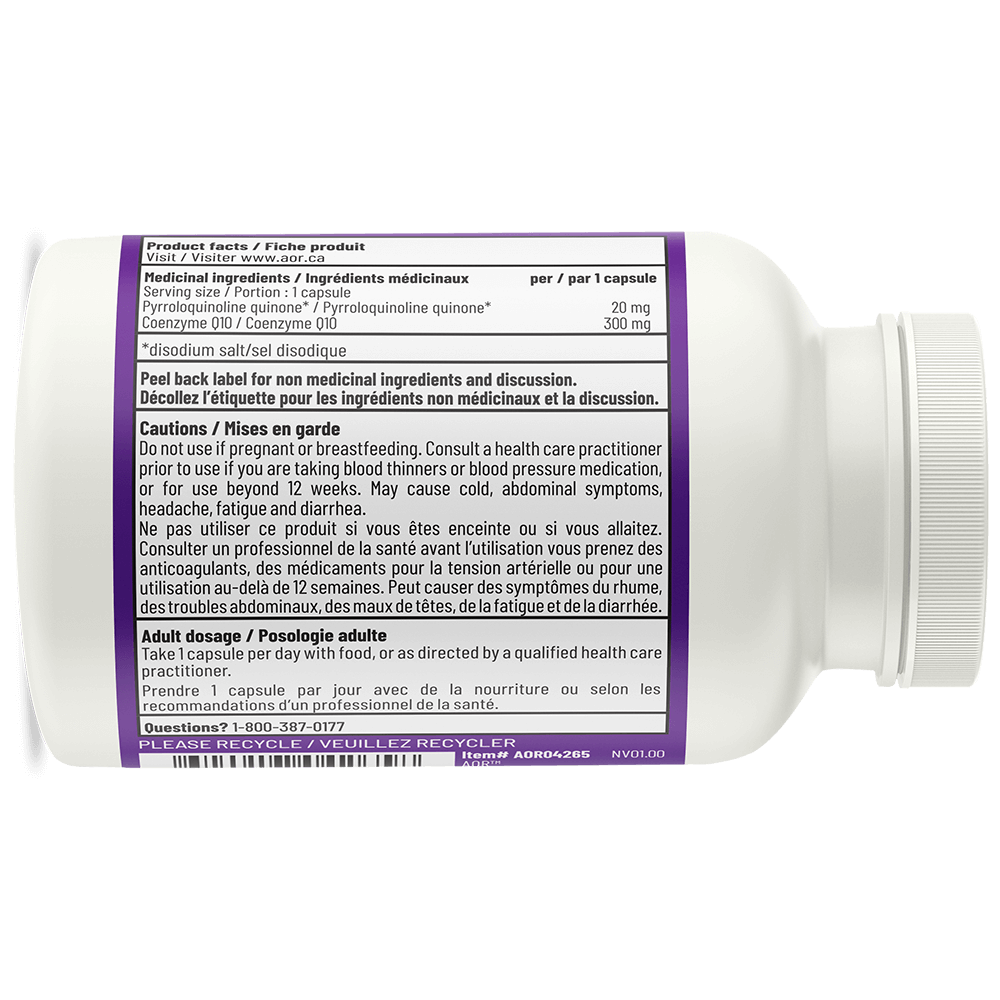 Le PQQ est un nutriment essentiel puisque votre corps ne peut le produire tout seul; il doit donc être obtenu à partir de l’alimentation ou de suppléments. Des recherches récentes indiquent que le profil nutritionnel spécifique de la PQQ fonctionne encore mieux lorsqu’il est associé à la Co-Q10. La formule d’AOR offre ces deux antioxydants exceptionnels aux doses et proportions cliniquement étudiées, pour une seule capsule par jour.