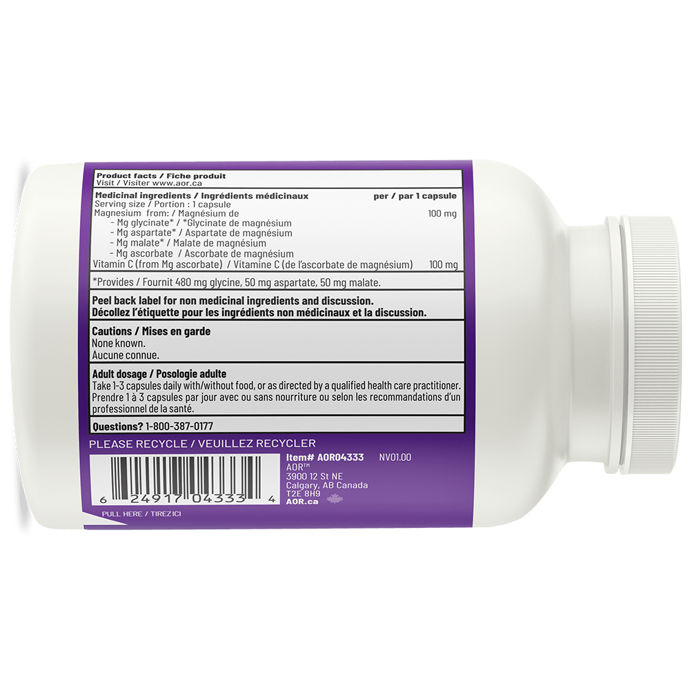 Le magnésium est un élément critique pour la production d’énergie dans le corps puisqu’il se lie à l’ATP (adénosine triphosphate) pour générer et utiliser cette énergie. Des quantités égales d’ions malate et aspartate sont ajoutées pour soutenir la navette malate-aspartate, un processus métabolique important impliqué dans la production d’énergie au sein de l’organisme. L’ascorbate de magnésium fournit de la vitamine C qui aide à prévenir la baisse des taux de vitamine C souvent associée aux faibles taux de magnésium. Le glycinate de magnésium est une forme bien tolérée et bien absorbée, car tout le composé traverse la paroi intestinale, ce qui réduit le risque de diarrhée.
