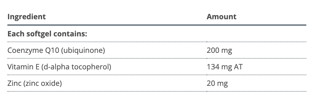 Coenzyme Q10 (ubiquinone) ...... 200 mgVitamine E (d-alpha tocophérol) ...... 134 mg ATZinc (oxyde de zinc) ...... 20 mg
