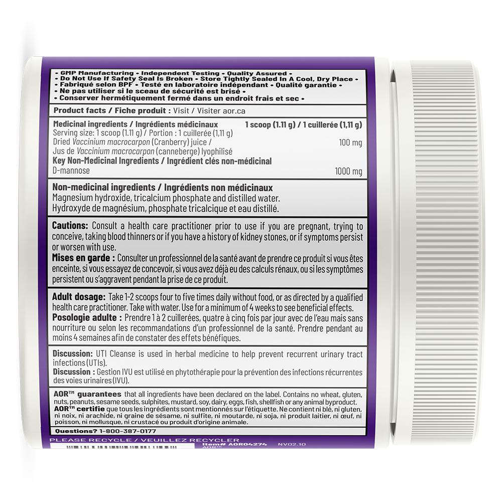 Cure IVU d’AOR est une préparation antiseptique naturelle qui fournit une petite quantité d’extrait de canneberge et une forte dose de D-mannose, en comprimés et en poudre pour votre commodité.