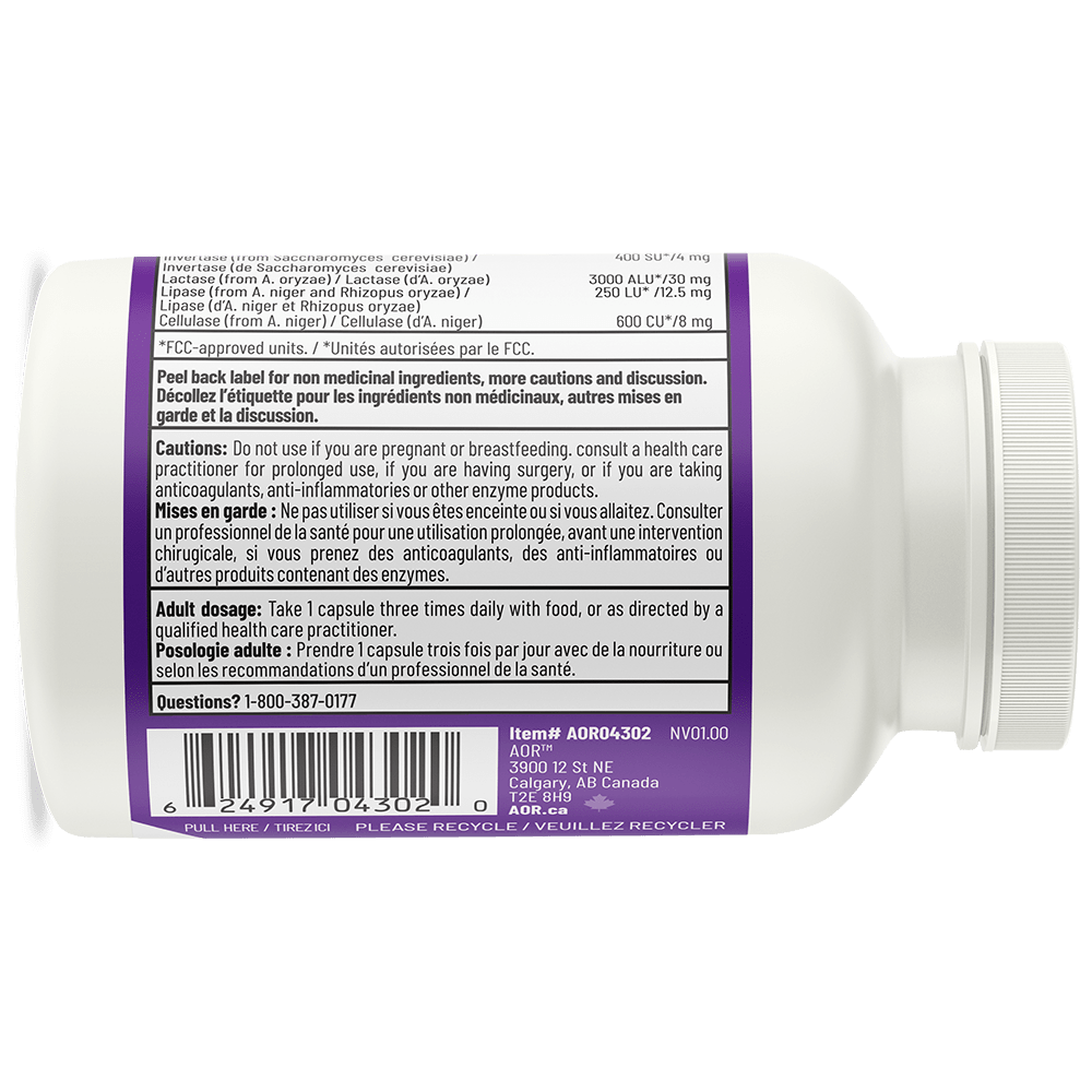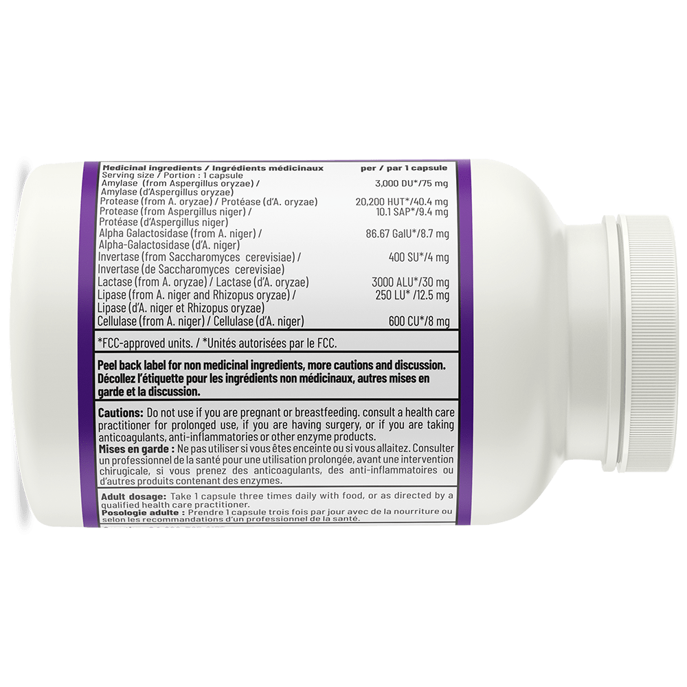 Digestase est une nouvelle formule enzymatique végétarienne améliorée contenant un mélange d’enzymes végétales indispensables à la digestion, notamment l’amylase qui digère les polysaccharides à longue chaîne, deux types de protéases qui digèrent les protéines complexes, la lipase qui digère les graisses et l’invertase qui digère le sucrose. Les éléments nouveaux récemment ajoutés à la formule de Digestase comprennent la cellulase qui digère les fibres cellulosiques, la lactase qui digère le lactose et l’alpha-galactosidase qui digère les oligosaccharides (les glucides complexes que l’on trouve dans les haricots et légumes) et réduit les gaz et ballonnements associés à ces aliments. En plus d’améliorer la digestion, ces enzymes peuvent également réduire l’inflammation et accélérer le temps de récupération après une blessure.