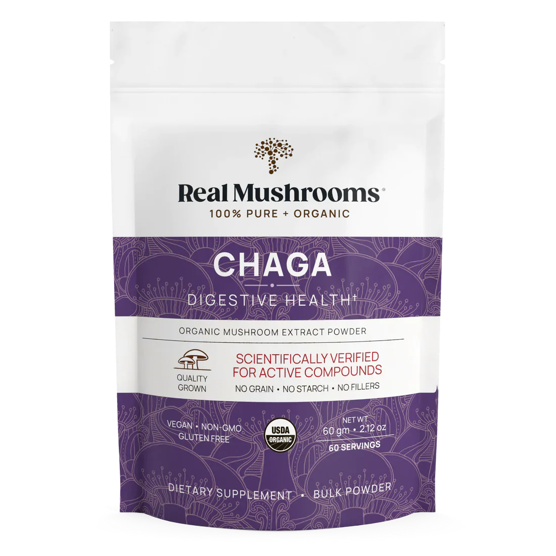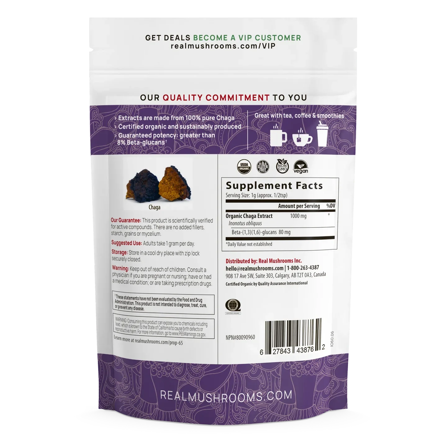Jusqu'à récemment, le Chaga ne pouvait pas être cultivé, mais maintenant en Finlande, ils inoculent des bouleaux avec ce champignon. Le Chaga cultivé en laboratoire ne se développe pas en sclérothium et comme il ne pousse pas sur le bouleau mais sur le grain, il ne contient pas les composés médicinaux importants qui proviennent du bouleau. L'extrait de Real Mushroom Siberian Chaga est récolté à l'état sauvage en Russie et testé par des laboratoires tiers pour les composés actifs bêta-D-glucans qui sont la quintessence de nutriments pour le système immunitaire.