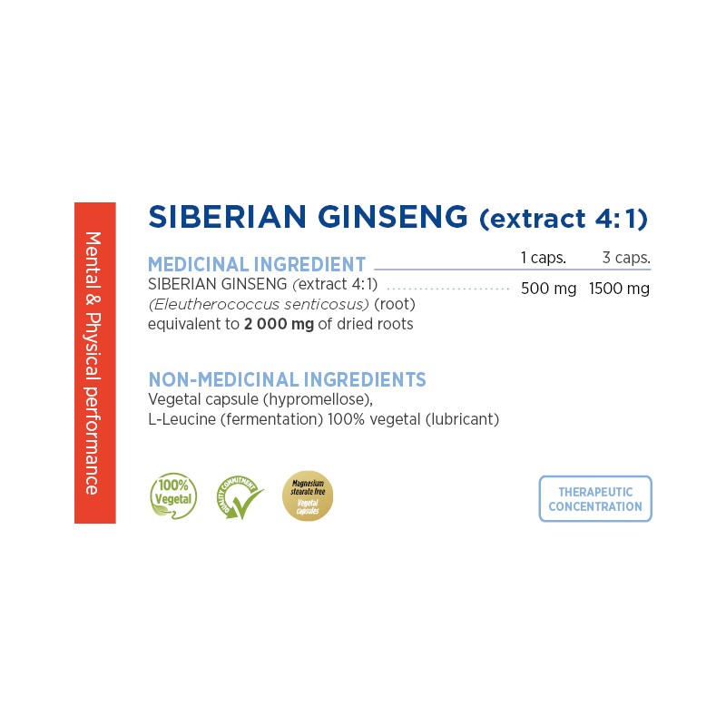 Gamma Force vous offre un extrait 4:1 équivalent à 2000 mg par capsule, fournissant une concentration thérapeutique efficace de toutes les molécules actives de la racine du ginseng sibérien.