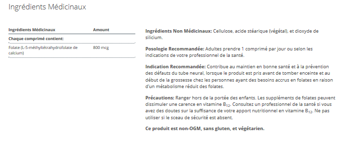 Contribue à maintenir une bonne santé et à prévenir les anomalies du tube neural lorsqu'il est pris avant la grossesse et en début de grossesse chez les personnes ayant des besoins accrus en folates en raison d'un métabolisme réduit des folates.