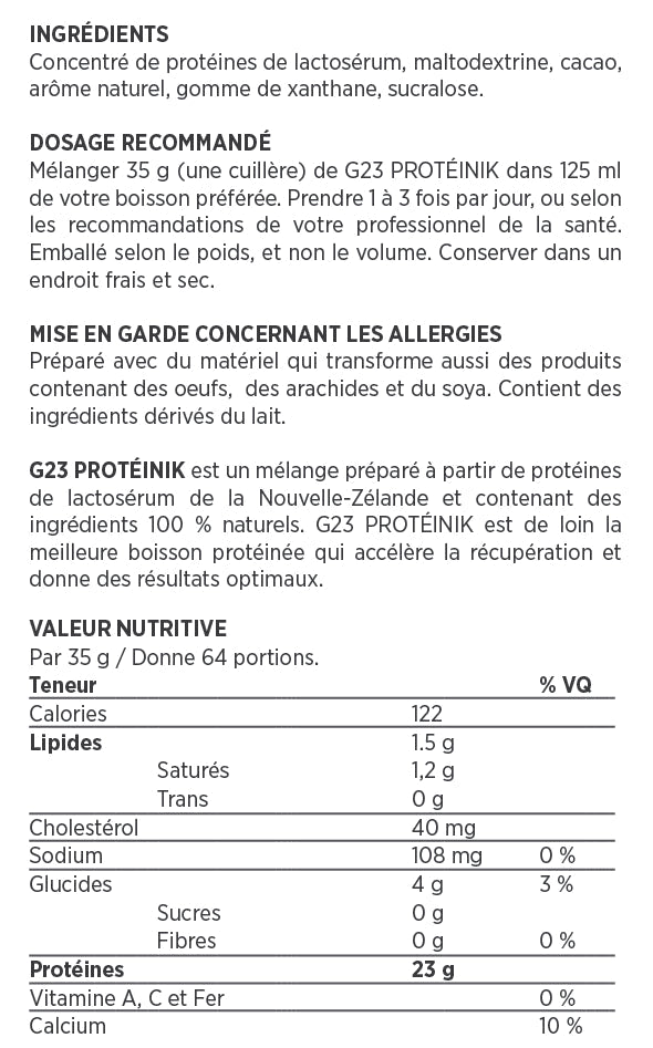 Après une session d’entraînement ou un stress physique, la protéine G23 contribue à améliorer votre récupération et à fortifier votre système immunitaire et digestif. La G23 aide à prévenir la dégradation du tissu musculaire et fait en sorte que le rétablissement se fasse plus rapidement. Elle est présentement disponible en 4 saveurs différentes : vanille, chocolat, fraises et mangues/ananas. Apportez les nutriments nécessaires à vos muscles afin d’accélérer et améliorer vos résultats.