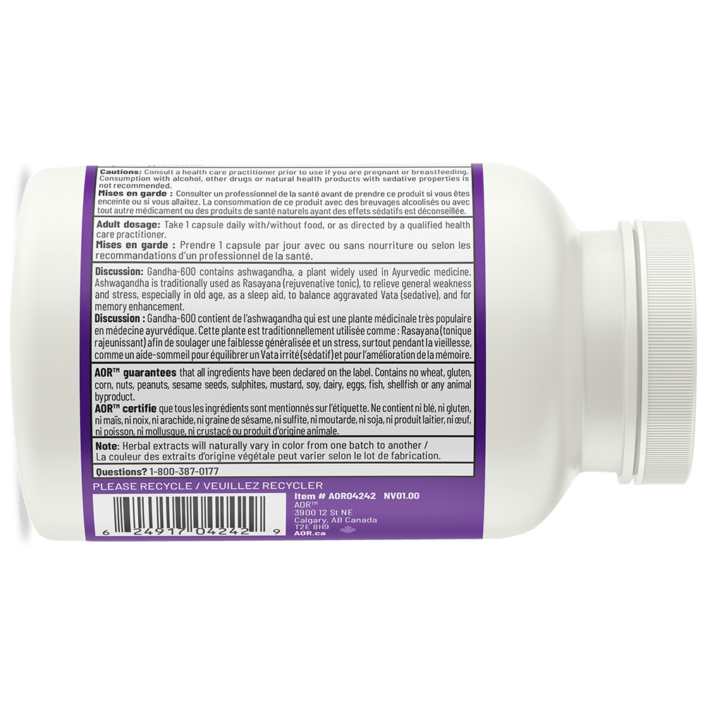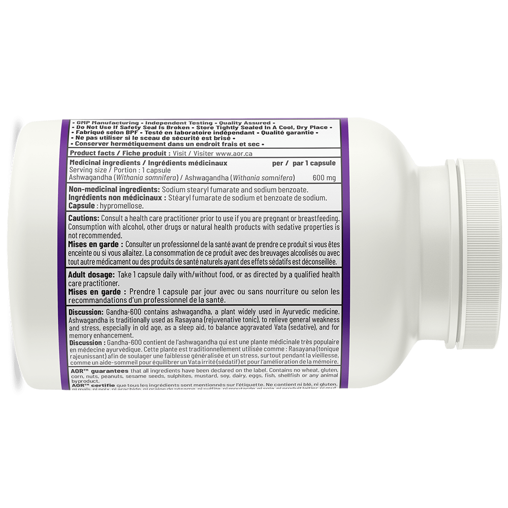 Il est important de toujours normaliser les extraits végétaux afin d’assurer des résultats fiables et uniformes pour les utilisateurs. Les withanolides sont les premiers composés actifs découverts dans l’ashwagandha. Récemment, un groupe de composés dérivé des withanolides, les sitoindosides, a été découvert et semble être responsable d’une grande partie des activités antistress et anti-anxiété de cette plante. Gandha-600 d’AOR est normalisé en withanolides et sitoindosides. Une seule capsule par jour est suffisante pour obtenir la dose recommandée : 600 mg d’un puissant extrait 10:1.