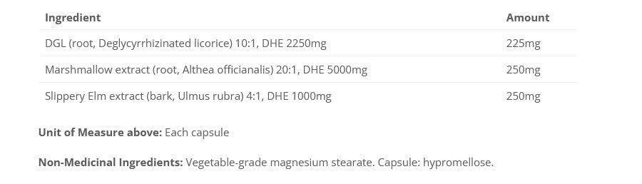 GI-Soothe fournit du DGL, de la racine de guimauve et de l'orme glissant dans des extraits très puissants pour des effets adoucissants et mucoprotecteurs efficaces sur le tractus gastro-intestinal. Disponible en flacons de 60 capsules végétales.