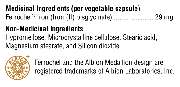 Le fer ferreux réagit avec la glycine pour former le chélate de bis-glycinate, un composé non chargé électriquement et totalement fonctionnel sur le plan nutritionnel. L'absence de charge électrique, peu commune pour un supplément de fer, rend moins probable que le Iron Glycinate™ puisse interférer avec l'absorption d'autres minéraux tels que le calcium, la vitamine E ou la vitamine C. La solubilité du fer provenant du chélate de bis-glycine n'est pas affectée par les changements de pH de 2 à 6. Cela signifie qu'il voyage sans changement à travers l'estomac, dans l'intestin, où il est absorbé et libéré pour être transporté dans tout l'organisme.
