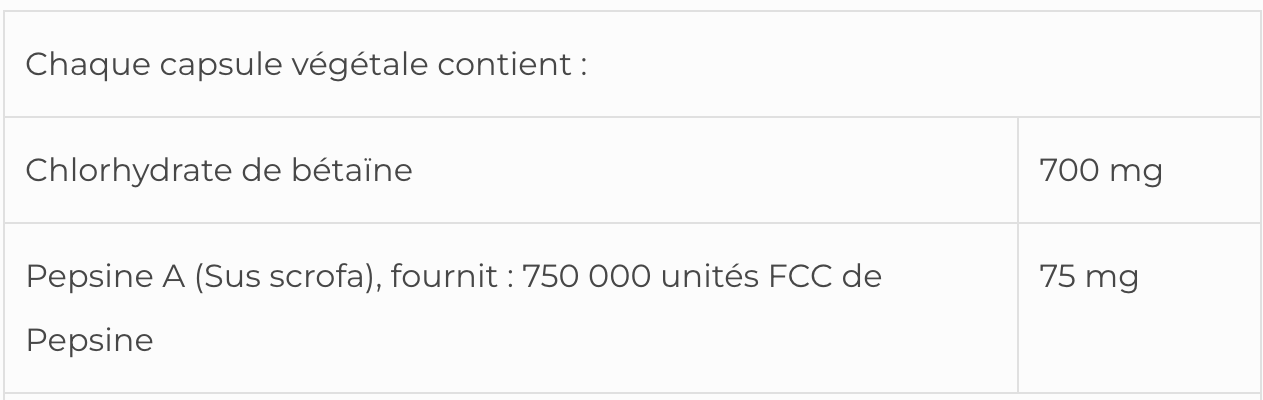 HCl-Pepsin SAP offre une combinaison optimale de bétaïne HCl et de pepsine qui peut aider à soutenir la digestion et à améliorer la fonction hépatique.