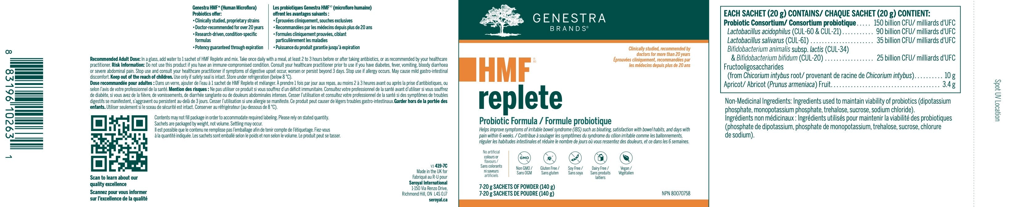 HMF Replete supports healthy intestinal microflora throughout antibiotic use and in adults with IBS. Les intestins contiennent plus de 400 espèces bactériennes, et l'équilibre bactérien doit être maintenu pour avoir des intestins sains. Les antibiotiques modifient la microflore intestinale et peuvent entraîner la prolifération de bactéries résistantes aux antibiotiques. Les probiotiques contribuent à maintenir une microflore naturellement saine et favorisent le maintien d'une flore intestinale normale après une antibiothérapie. Le SCI touche près de 5 millions de Canadiens et peut également résulter d'une altération de la microflore intestinale. Cela entraîne une malabsorption des acides biliaires - qui aident à la digestion des graisses - et augmente à son tour la sécrétion de liquide et de mucus dans le côlon pour diluer les acides biliaires. Comme les les lactobacilles et les bifidobactéries aident à réabsorber les acides biliaires, moins d'eau pénètre dans le côlon, ce qui diminue l'apparition de diarrhées. Dans un essai contrôlé par placebo et à répartition aléatoire portant sur 52 adultes atteints du SCI, la supplémentation quotidienne en CUL-60, CUL-21, CUL-20 et CUL-34 a amélioré sensiblement la qualité de vie et les taux de satisfaction concernant les habitudes intestinales, et a réduit le nombre de jours avec douleur dans les 10 semaines.