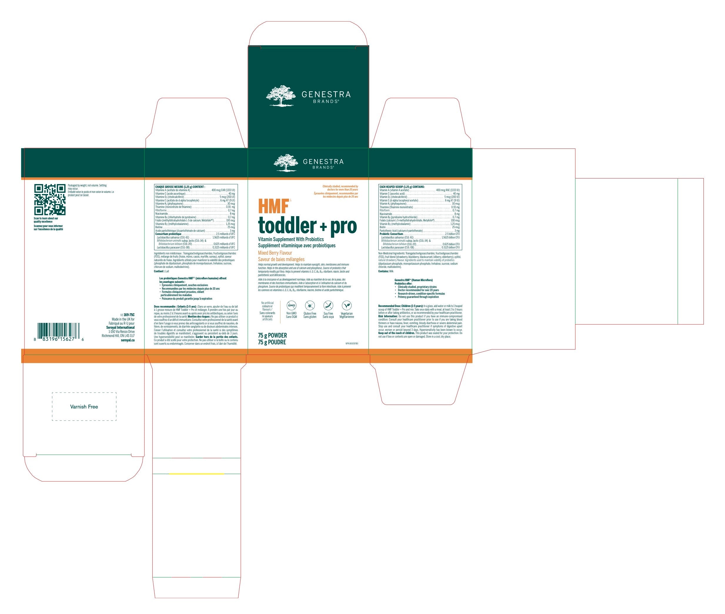 HMF® Toddler + Pro soutient la nutrition pédiatrique et la santé intestinale grâce à un ensemble unique de souches probiotiques d'origine humaine et plus de 10 vitamines et antioxydants. Les probiotiques choisis pour cette formule (Lactobacillus salivarius CUL-61, Bifidobacterum animalis subsp. lactis CUL-34, Bifidobacterium bifidum CUL-20 et Lactobacillus paracasei CUL-08) procurent une forte adhérence épithéliale et une tolérance naturellement élevée à l'acide gastrique. HMF® Toddler + Pro fournit également des vitamines et des antioxydants pour soutenir la croissance et le développement normaux des enfants de 1 à 5 ans. Les vitamines A, C, D3 et K1 soutiennent la formation et le maintien des os, du cartilage, des dents et des gencives. La formation des globules rouges et/ou le métabolisme des macronutriments sont soutenus par les vitamines B1, B2, B3, B5, B6, la biotine, le folate (Metafolin® L-5-MTHF) et la vitamine B12. Une seule dose quotidienne de cette formule contribue à prévenir les carences vitaminiques et favorise la santé intestinale. Notre formule pratique de longue conservation a une concentration garantie jusqu’à l'expiration. Elle a une délicieuse saveur naturelle de baies mélangées et ne contient ni sucre ajouté, ni édulcorants, ni arômes artificiels.