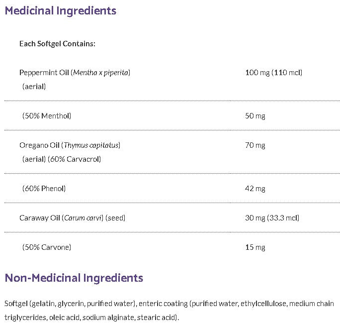 Ingrédients médicinaux : Huile de menthe poivrée (Mentha x piperita) (aérienne) 100 mg (110 mcl) (50% Menthol) 50 mgHuile d'origan (Thymus capitatus) (aérienne) (60% Carvacrol) 70 mg (60 % phénol) 42 mgHuile de carvi (Carum carvi) (graine) 30 mg (33,3 mcl) (50% Carvone) 15 mg Ingrédients non médicinaux : Gélule (gélatine, glycérine, eau purifiée), enrobage entérique (eau purifiée, éthylcellulose, triglycérides à chaîne moyenne, acide oléique, alginate de sodium, acide stéarique).