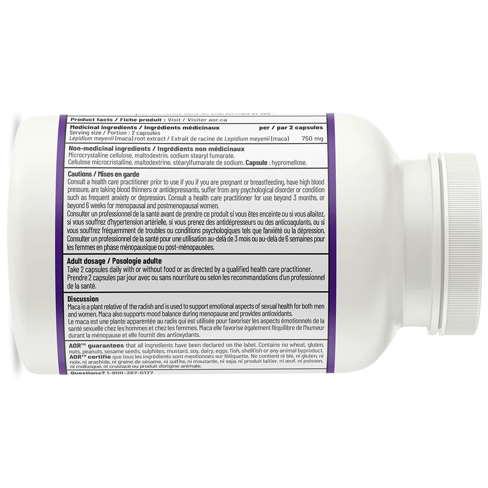 La maca (Lepidium meyenii) est une plante crucifère riche en minéraux, originaire du Pérou où ses racines sont traditionnellement consommées comme légumes. La maca est un adaptogène capable d’équilibrer les effets des principales hormones stéroïdes telles que l’œstrogène, la progestérone et la testostérone, et semble générer des effets qui sont spécifiques à l’état de l’individu, en augmentant les faibles taux de certaines hormones et abaissant les taux d’hormones en excès. Les professionnels de la santé qui intègrent la maca dans leurs traitements rapportent que la maca aide au maintien de la fonction sexuelle chez les hommes et femmes vieillissants, et peut être utile pour la normalisation des symptômes ménopausiques et prémenstruels chez les femmes.