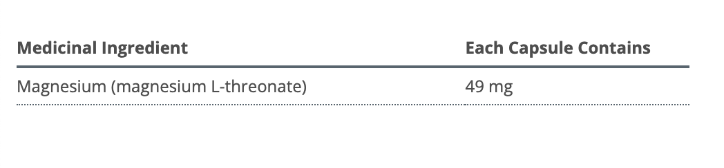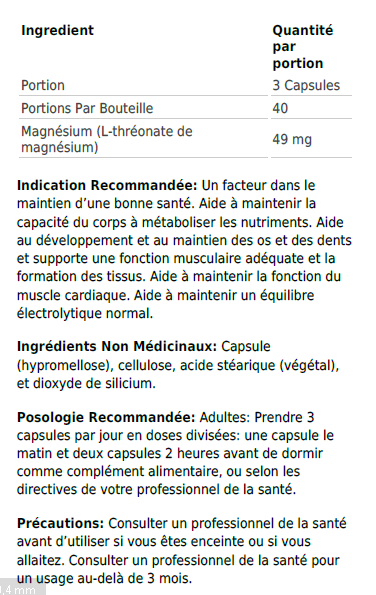Ingrédients médicinaux (par comprimé): Magnésium (L-thréonate de magnésium) ...... 49 mg
