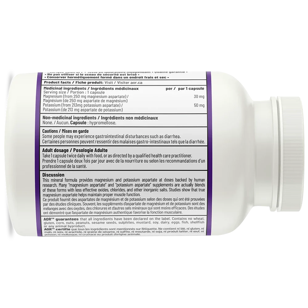 L’aspartate ou acide aspartique est un acide aminé naturel qui, en association avec le magnésium, joue un rôle dans la production de l’adénosine triphosphate (ATP) qui est la source d’énergie du corps. Le potassium est un électrolyte essentiel impliqué dans les fonctions électriques et cellulaires aidant à la régulation de l’équilibre acido-basique de l’organisme et au bon fonctionnement des cellules nerveuses; ce qui est essentiel pour la transmission des messages neurochimiques. Le magnésium et le potassium sont connus pour coopérer dans le corps, le magnésium facilitant le transport cellulaire du potassium.