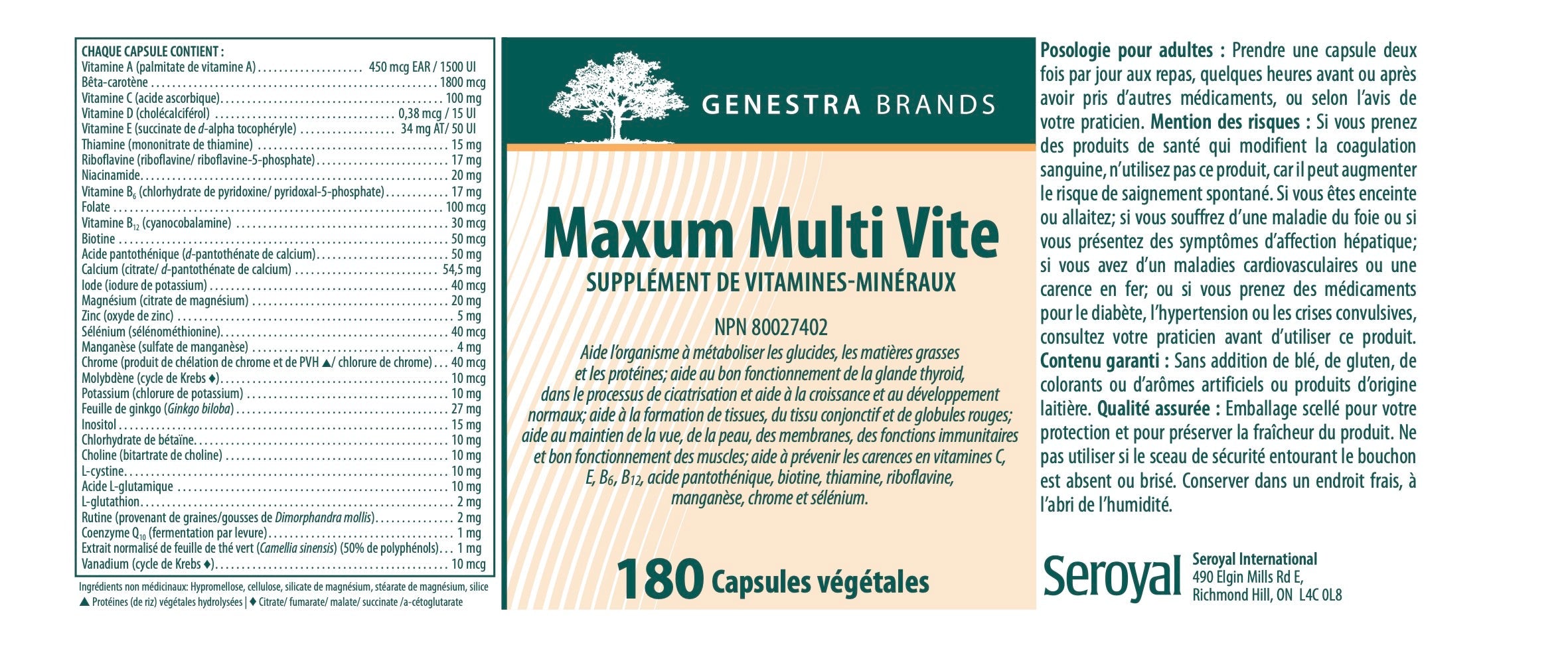 Maxum Multi Vite est une formule composée de plusieurs vitamines qui procure également cinq sources d'antioxydant pour le maintien d'une bonne santé. Le sélénium est nécessaire pour la production de sélénoprotéines, notamment les glutathion-peroxydases et la sélénoprotéine P, qui jouent un rôle dans le système de défense antioxydant. La vitamine C est le plus important antioxydant aqueux dans le plasma, le liquide interstitiel et le compartiment soluble des cellules. En tant que première ligne de défense dans ces secteurs, la vitamine C prévient les dommages à l'ADN causés par les radicaux libres et aide à recycler la vitamine E pour protéger les membranes lipidiques du stress oxydatif. La rutine et des extraits de thé vert procurent une dose supplémentaire d'antioxydants pour le maintien d'une bonne santé. Les vitamines B aident à contrôler des centaines de réactions enzymatiques, y compris le métabolisme des macronutriments la niacine, la thiamine et la biotine fournissent des substrats pour la production énergétique dans le cycle de Krebs, tandis que le folate et les vitamines B6 et B12 aident à convertir l'homocystéine en méthionine pour la production de protéines. Le chrome favorise le sain métabolisme du glucose en régulant la fixation du glucose dans les cellules et en promouvant son entreposage sous forme de glycogène. La bêtacarotène est un pigment caroténoïde de provitamine A qui se retrouve naturellement dans les plantes. Comme elle peut être convertie en vitamine A dans le corps, elle est une importante source de vitamine A qui contribue à la santé des yeux, de la peau, des membranes et du système immunitaire.