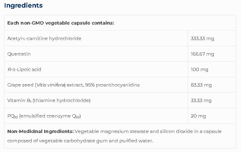Mito SAP contient une combinaison d’ingrédients actifs, à savoir la N-acétyl-L-carnitine, la quercétine, l’acide R-α-lipoïque, l’extrait de pépins de raisin, la thiamine et la coenzyme Q10 (sous forme de PQ10; coenzyme Q10 émulsionnée par pois pour une meilleure absorption) du la plus haute qualité et efficacité pour un soutien mitochondrial optimal.