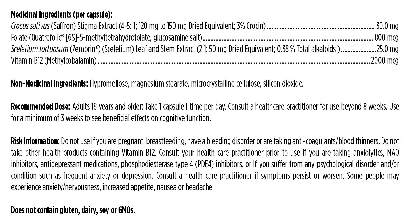 Un mélange unique de vitamine B12 méthylée, de folate, de safran et d'extrait de Sceletium pour favoriser un état d'esprit calme et positif. Favorise une humeur détendue et des réactions normales au stress.