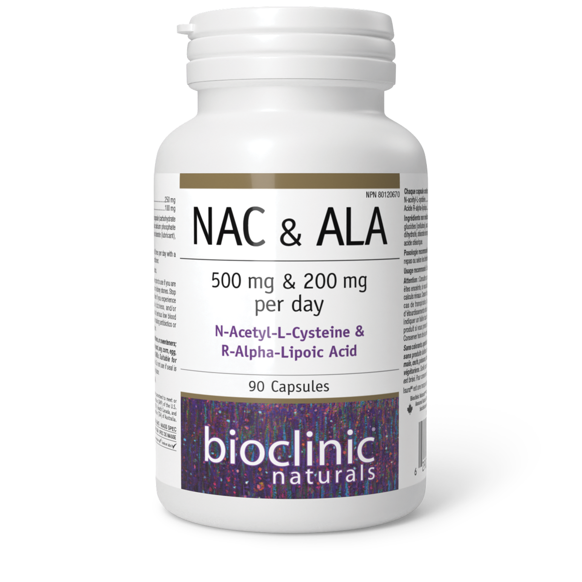 La NAC et l'ALA sont des nutriments hautement complémentaires, essentiels à la fonction cellulaire et à l'atténuation des dommages associés à l'hyperglycémie. La NAC stimule la synthèse du glutathion, souvent appauvri dans les maladies cardiovasculaires et les conditions de stress métabolique et oxydatif. La NAC a également une activité antioxydante directe, restaure les pools de thiols intracellulaires et a un effet anti-inflammatoire, médié par l'inhibition du facteur nucléaire kappa. B (NF-κB). Le glutathion est nécessaire à la détoxification de nombreux polluants organiques persistants, composés connus pour altérer la fonction mitochondriale, le métabolisme du tissu adipeux et la fonction des cellules des îlots pancréatiques. En plus du soutien du glutathion, la NAC améliore la protection antioxydante grâce à de multiples voies, y compris la régulation positive de l'activation du facteur nucléaire (dérivé érythroïde 2)-like 2 (Nrf2) et de la phosphoinositide 3-kinase/protéine kinase B (PI3K/AKT), suggérant un potentiel important d'atténuation de la pathologie due au stress oxydatif. Essais cliniques ont montré que la NAC rétablit les niveaux de glutathion intraplaquettaire dans certaines populations – un marqueur du risque athérothrombotique – réduit l'homocystéine et améliore la fonction endothéliale dans les maladies coronariennes (à des doses de 600 à 1 800 mg/jour).