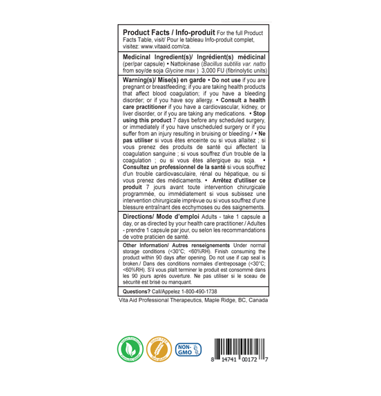 Ingrédients par capsules: Nattokinase (Bacillus subtilis var. natto de Glycine max) 3000 FU* *FU - unités fibrinolytiques Ingrédients non médicinaux : Maltodextrine, L-leucine, cellulose microcristalline, dioxyde de silicium.