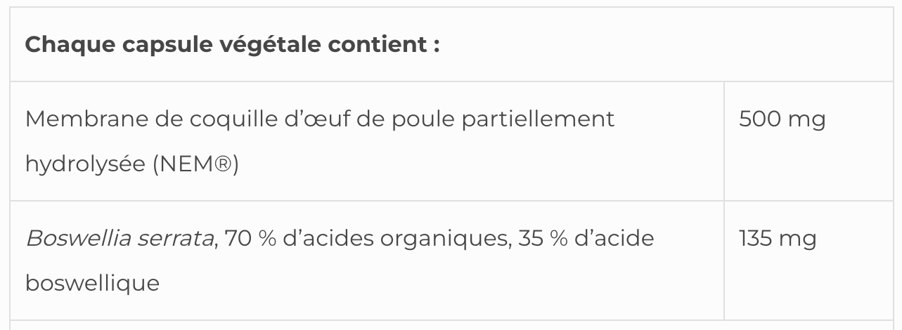 Des études ont démontré que NEM® peut améliorer les symptômes de douleur et de raideur associés à l’arthrose dans les 7 à 10 jours suivant le début de la supplémentation.