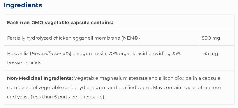 La membrane naturelle de coquille d’œuf (NEM®) est la fine membrane qui forme la paroi interne des coquilles d’œufs de poule. Il contient de nombreux ingrédients connus pour aider à soutenir la santé des articulations, notamment le collagène, la glucosamine, l’acide hyaluronique, les glycosaminoglycanes (GAG) et le sulfate de chondroïtine, ainsi que plusieurs autres protéines et peptides.