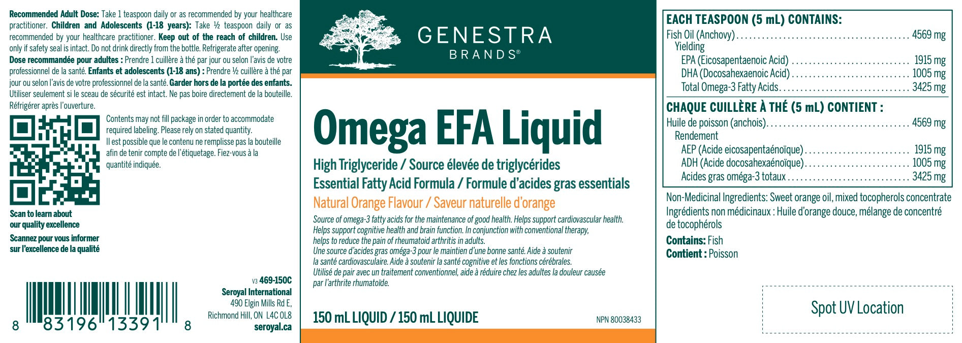 L’Omega EFA Liquid est notre produit AGE liquide le plus concentré, fournissant 1915 mg d’EPA et 1005 mg de DHA par portion. Ces dosage et rapport d’EPA à DHA concordent avec la dose quotidienne recommandée pour promouvoir un équilibre de l’humeur chez les adultes, et des essais en clinique ont démontré que la supplémentation à ce dosage quotidien améliore l’équilibre de l’humeur. L’Oméga AGE fournit aussi le dosage recommandé d’EPA et de DHA pour réduire la douleur d’AR chez les adultes, lorsqu’il est accompagné d’une thérapie traditionnelle. Il a été démontré que chez les patients qui ont de l’AR, une supplémentation d’huile de poisson à forte dose améliore considérablement le mécanisme principal de soulagement de la douleur de l’acétaminophène en augmentant l’inhibition dépendante de l’acétaminophène des enzymes cyclooxygénase (COX).