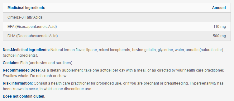 Chaque gélule fournit 500 mg de DHA plus 100 mg d'acide eicosapentaénoïque (EPA) pour aider à maintenir un statut optimal de DHA. Consultez votre professionnel de la santé avant l'utilisation si vous prenez des anticoagulants ou si vous prévoyez subir une intervention chirurgicale.