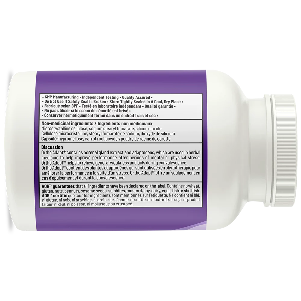 Ortho Adapt est la formule spéciale anti-stress d’AOR, contenant de l’extrait de glande surrénale, des plantes adaptogènes ashwagandha, rhodiola, réglisse et ginseng sibérien, ainsi que les vitamines C et B5. L’extrait de glande surrénale est un moyen éprouvé de fournir des facteurs clés directement utilisables par les glandes surrénales (aussi appelées glandes « anti-stress »), d’une manière que les nutriments et plantes médicinales ne peuvent fournir individuellement. C’est l’une des formules les plus vendues d’AOR, grâce à ses effets d’amélioration du niveau d’énergie et une meilleure capacité à faire face au stress.