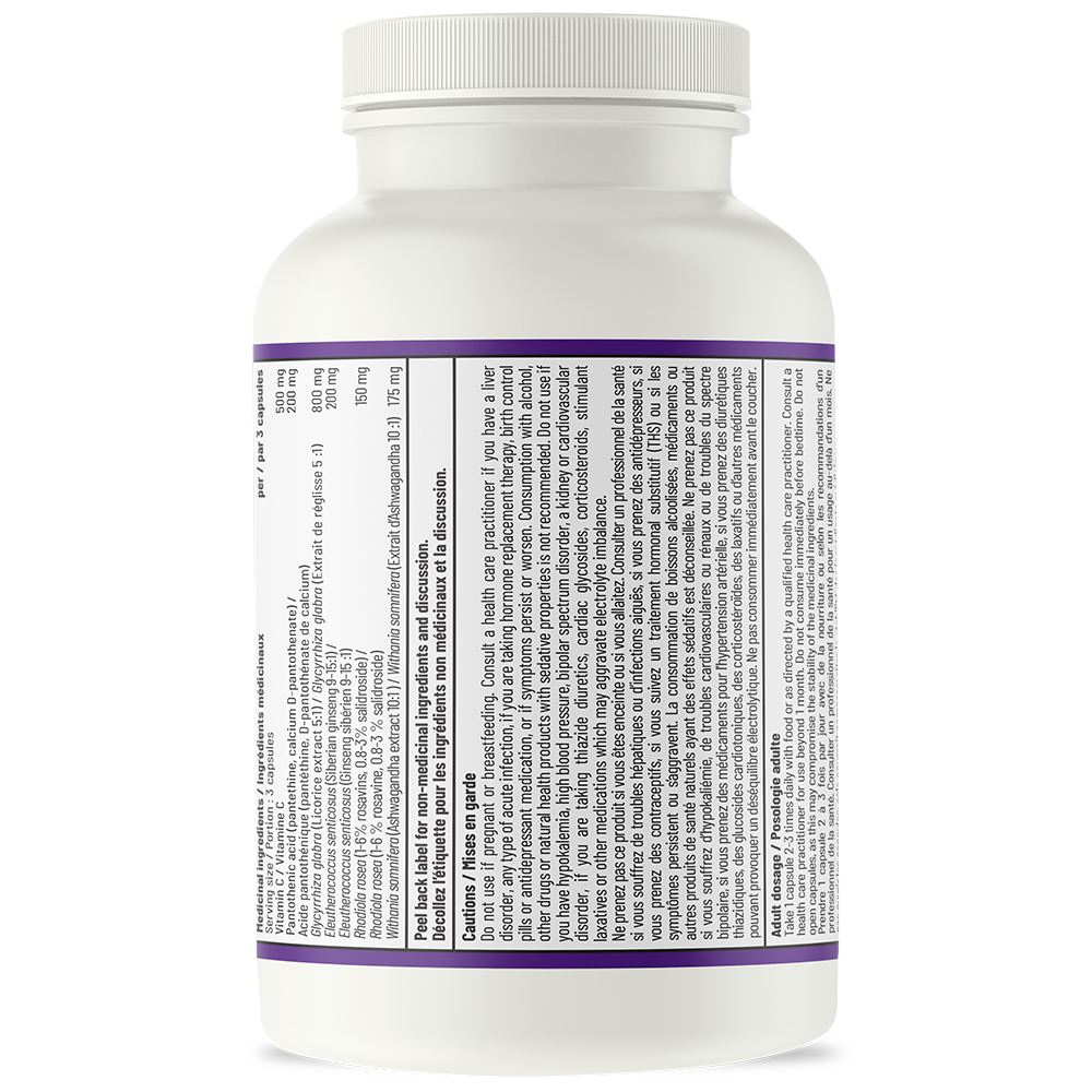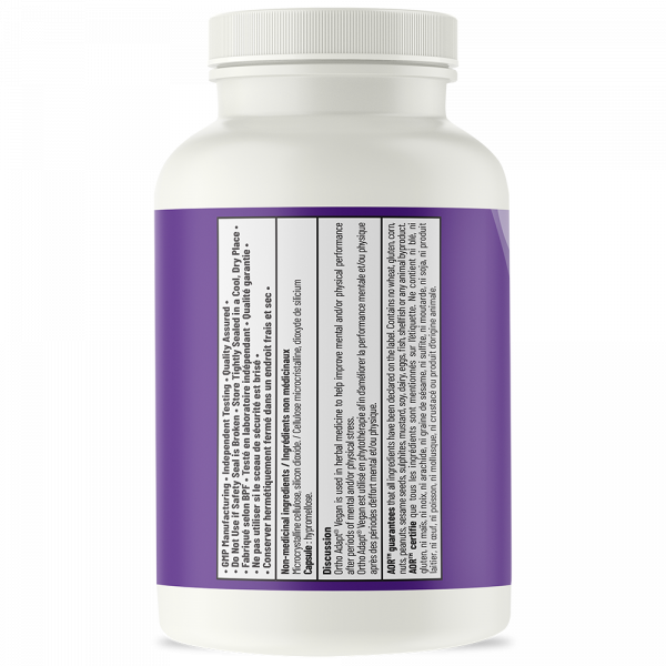 Ortho Adapt Végétalien a été conçu pour aider le corps à gérer efficacement le stress, en stimulant les glandes surrénales et en aidant à prévenir l’insuffisance surrénale. Les adaptogènes sont des substances qui soutiennent le corps pendant les périodes de stress. Elles activent les défenses non spécifiques de l’ensemble du corps, redirigeant les ressources de l’organisme pour fournir l’énergie nécessaire à un engagement actif avec tout facteur de stress, qu’il soit physique, émotionnel ou environnemental. Ortho Adapt Végétalien fournit de l’ashwagandha, de la Rhodiola rosea, de la réglisse et du ginseng sibérien, quatre plantes adaptogènes efficaces qui soutenues par les données d’études cliniques. Ce produit contient également des vitamines C et B5, qui sont rapidement épuisées pendant les périodes de stress et sont nécessaires aux glandes surrénales pour la fabrication des hormones du stress. Tous ces facteurs contribuent à la prévention de la fatigue et à l’épuisement professionnel, à l’augmentation du niveau d’énergie et à favoriser la capacité à faire face à la situation.